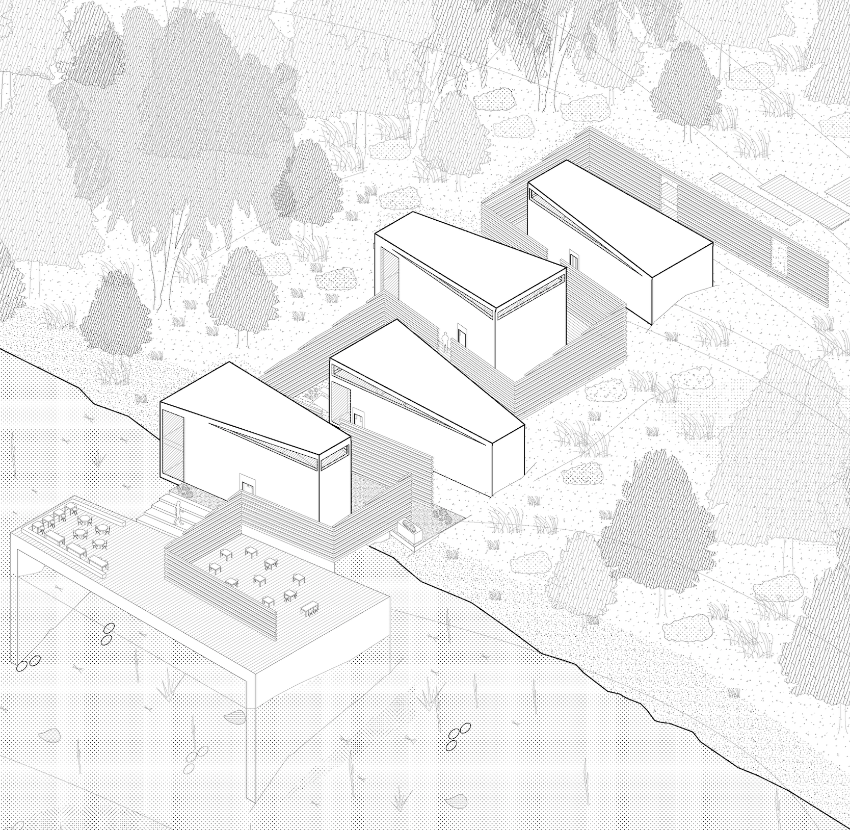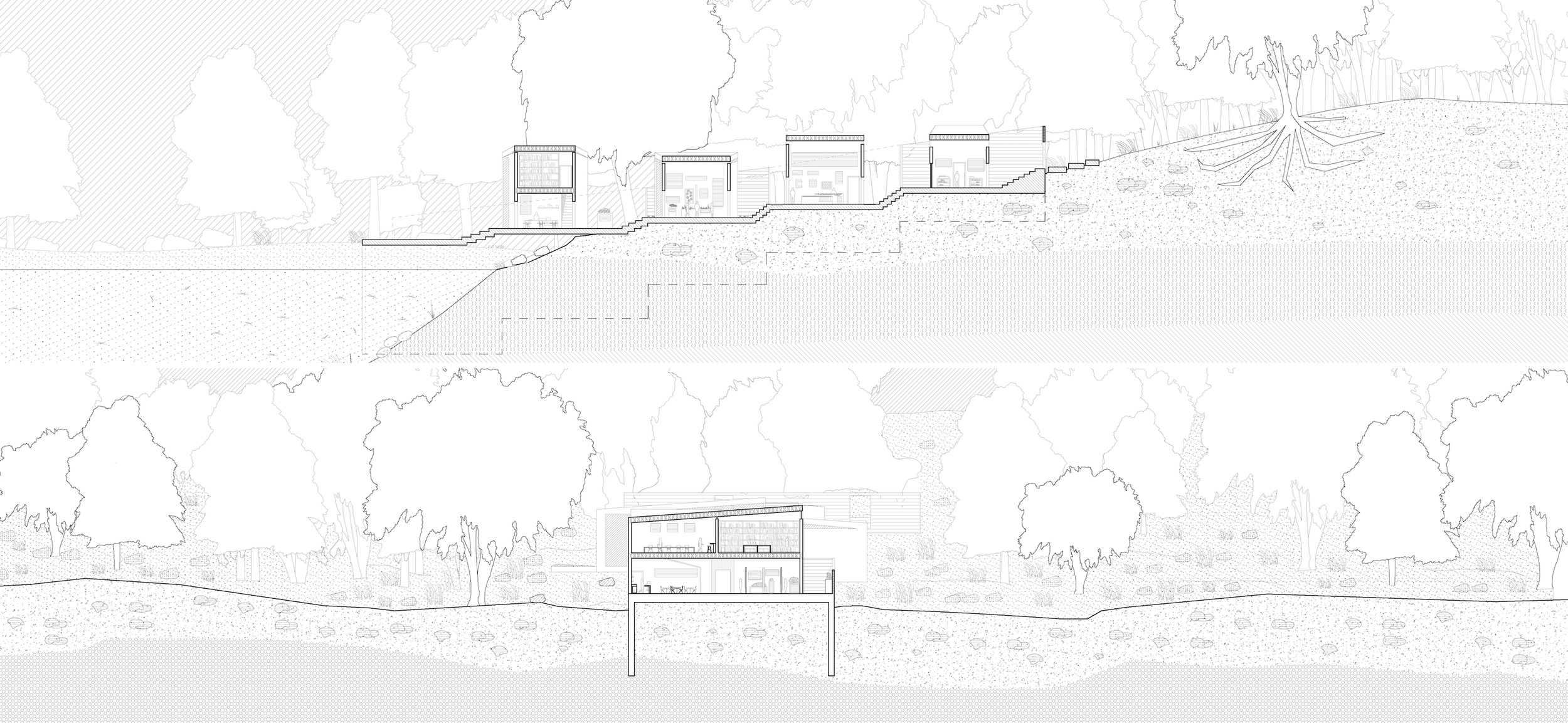 Emerged in the historically rich area of Jefferson Island in Southern Louisiana, the proposal integrates the site’s hillside condition, and salt dome lake condition, into a prolonged experience that weaves program between the rural exterior and the intentional interior. Each programmatic section of the proposal is strategically framed by a delicate wrapping fence that allows for a feeling of environmental meandering and a possibility for direct circulation.