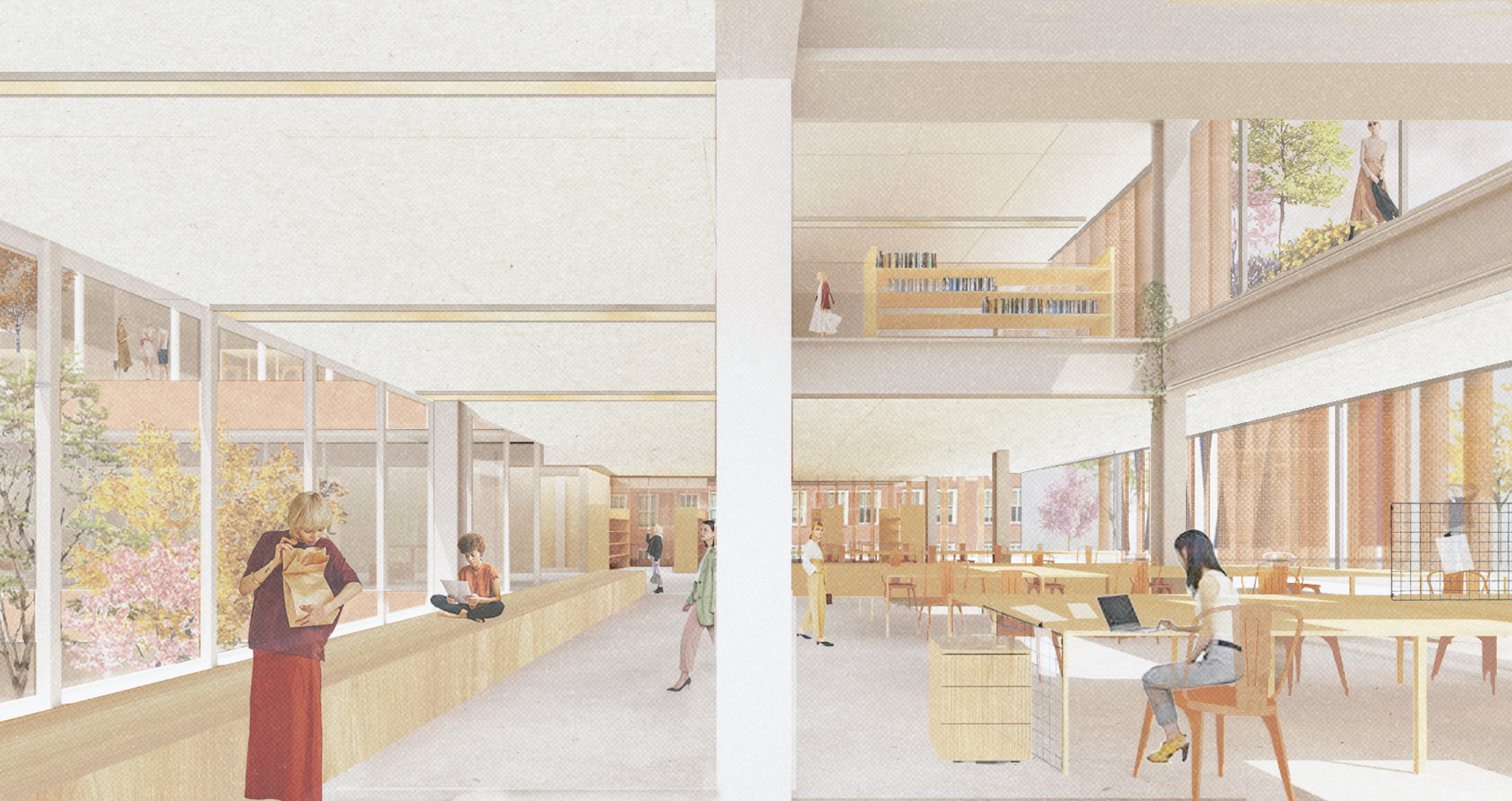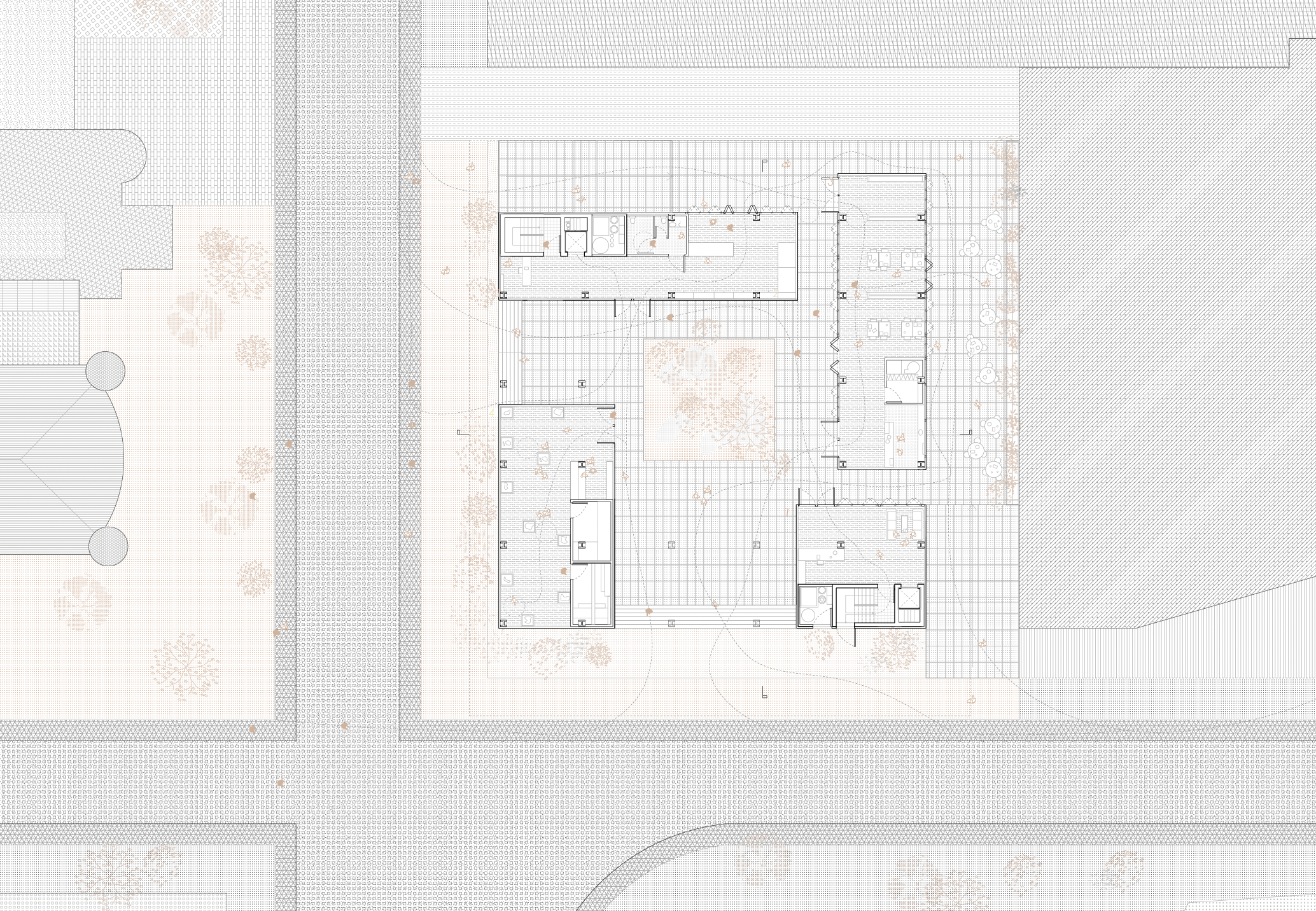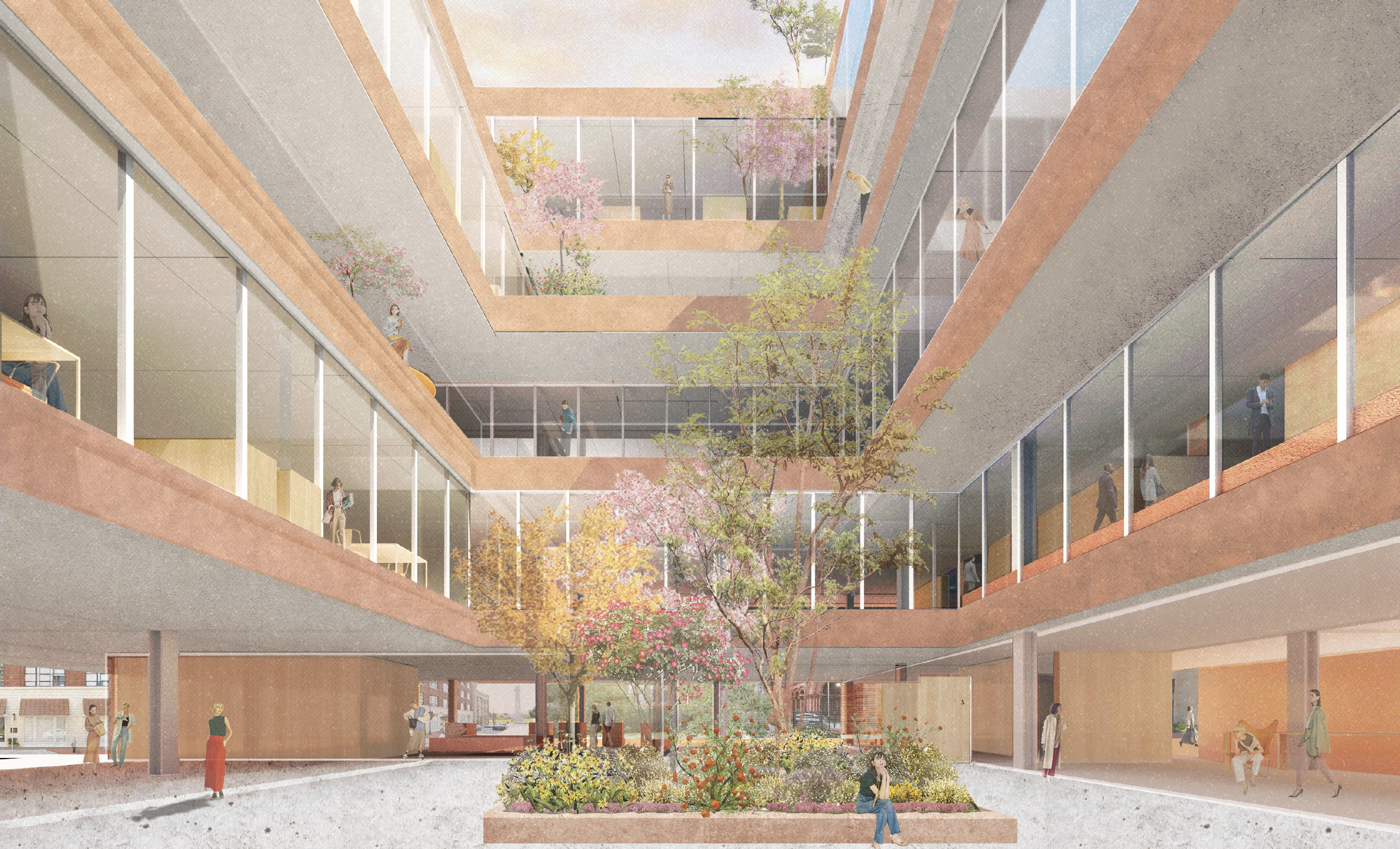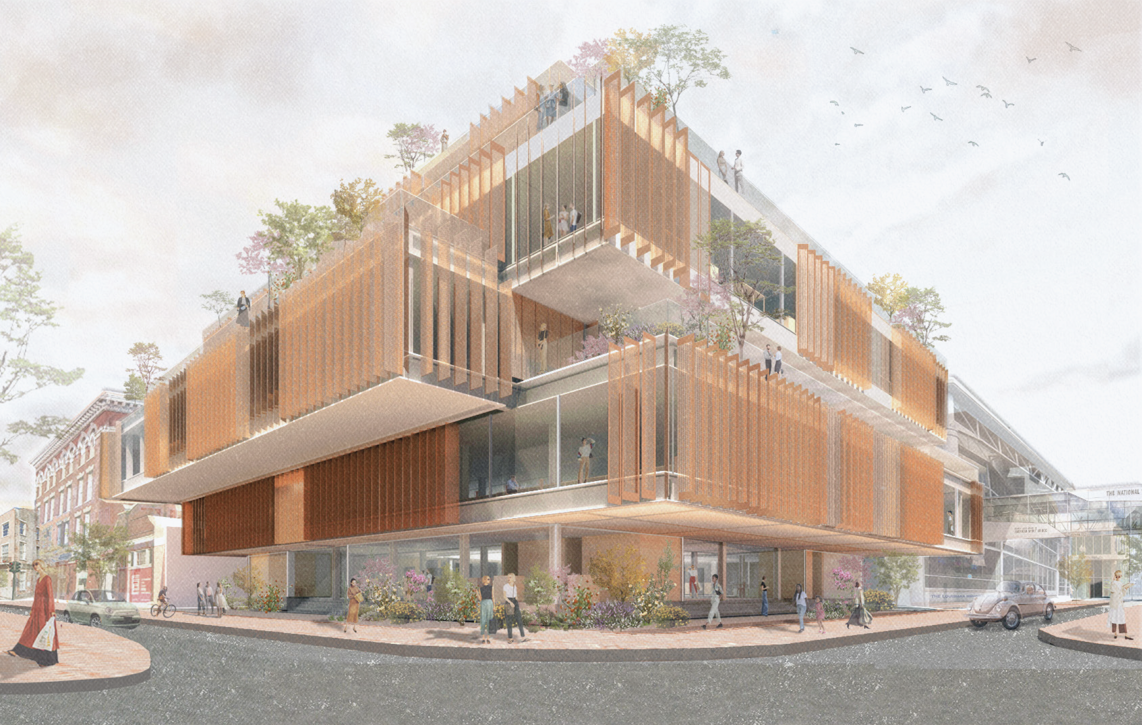 Imagined within New Orleans’ CBD, the proposal works to unify both its setting and visitors within the building through sectional relationships, moving from the public ground floor to the increasingly private upper offices. Offsetting of a parti cube with a centralized courtyard allows for grand terrace spaces on the interior and exterior, made possible by steel cantilevers and trusses within the proposal’s structure. Openness is welcomed through a transparent and fluid ground floor broken into four permeable interiors, as well as open office plans above.