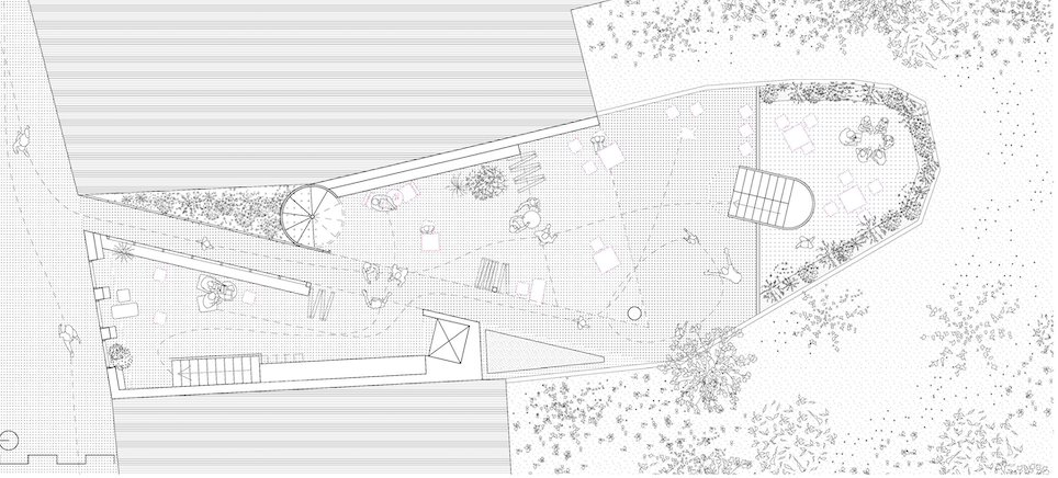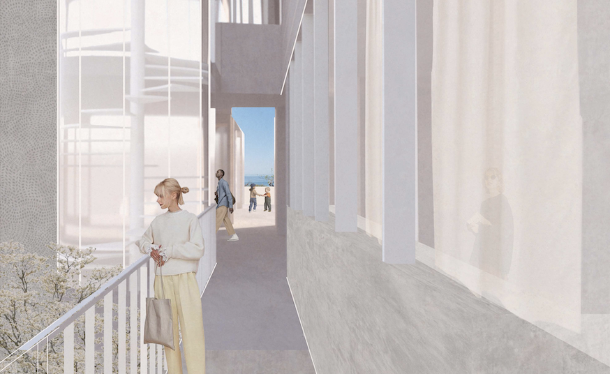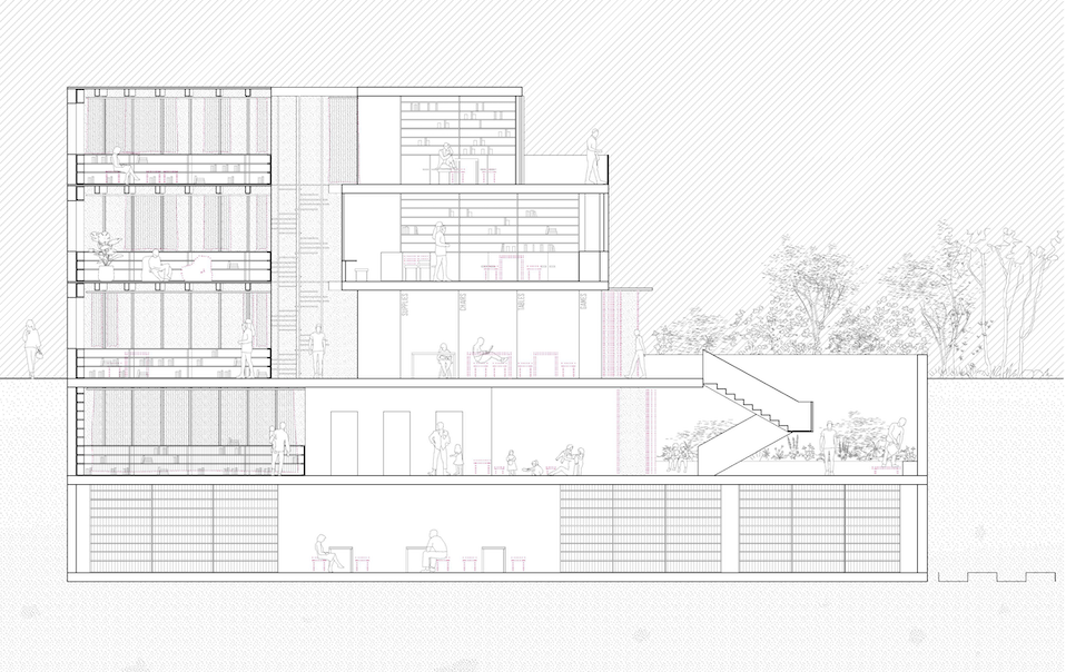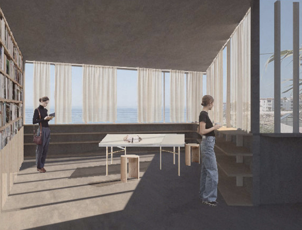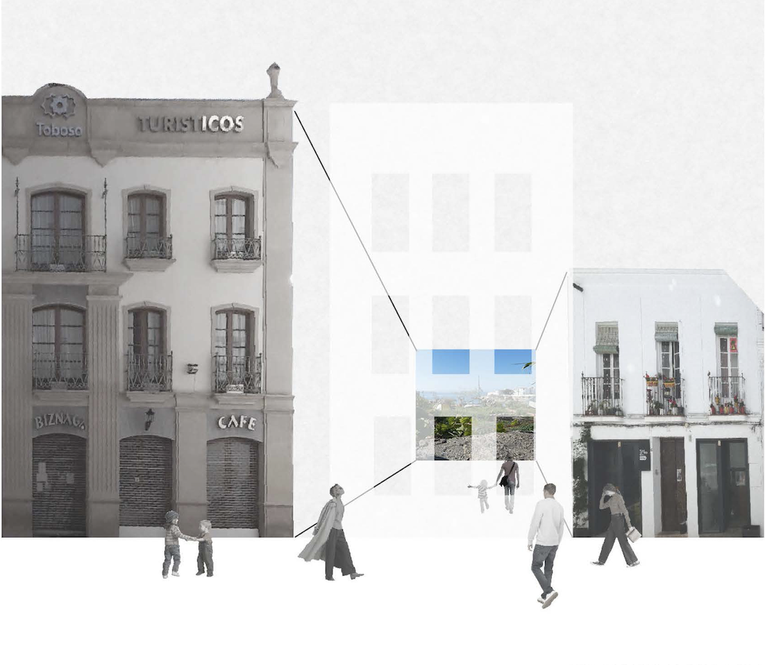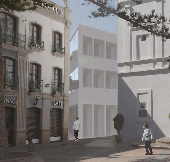 A theoretical competition entry for a library in Nerja, Spain. The project proposes a new street through the lot that connects the plaza and ocean view in a similar manner as the nearby meandering streets.
